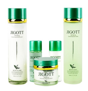 WELL-BEING GREEN TEA SKIN CARE 3SET Набор для ухода за лицом (тонер для лица, эмульсия для лица, крем для лица) ТМ JIGOTT В набор для ухода за лицом с ЭКСТРАКТОМ ЗЕЛЕНОГО ЧАЯ входит тоник, лосьон, крем. 1. WELL-BEING GREEN TEA SKIN TONER Тонер для лица: содержит экстракт зеленого чая (500 ррm), который успокаивает и увлажняет кожу. Текстура на водной основе освежает, тонизирует и разглаживает кожу.